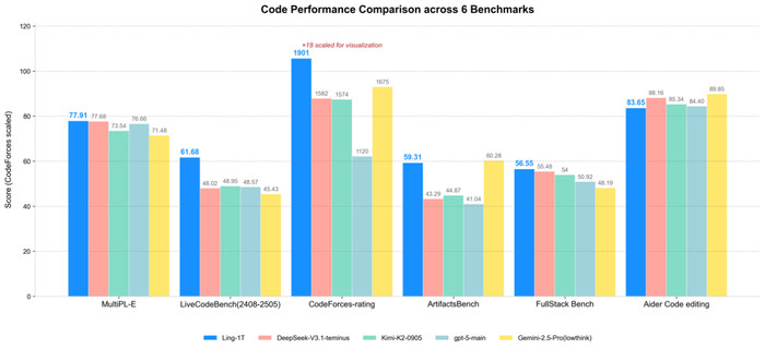 另外,蚂蚁百灵团队提出了“语法-功能-美学”的混合奖励机制,在确保代码正确、功能完善的同时持续提升这个万亿基座对视觉美学的认知。在ArtifactsBench前端能力基准上,Ling-1T得分59.31,在可视化和前端开发任务领域,仅次于Gemini-2.5-Pro-lowthink的得分60.28,以显著优势位居开源模型榜首。