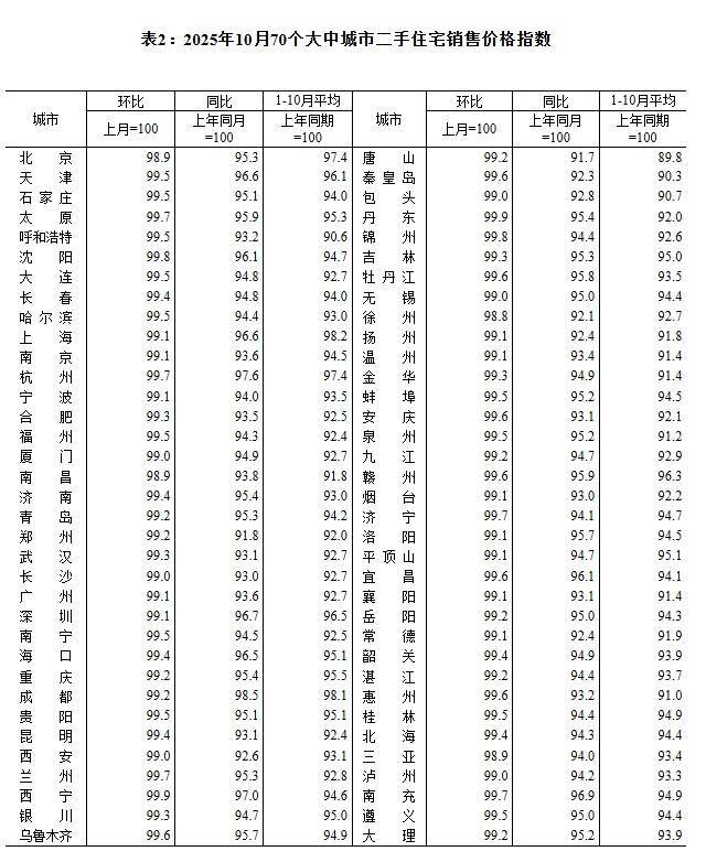 10月份,一线城市二手住宅销售价格环比下降0.9%,降幅比上月收窄0.1个百分点。其中,北京、上海、广州和深圳分别下降1.1%、0.9%、0.9%和0.9%。二线城市二手住宅销售价格环比下降0.6%,降幅收窄0.1个百分点。三线城市二手住宅销售价格环比下降0.7%,降幅扩大0.1个百分点。