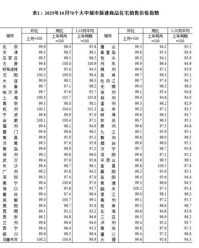 10月份,一线城市新建商品住宅销售价格环比下降0.3%,降幅与上月相同。其中,上海上涨0.3%,北京、广州和深圳分别下降0.1%、0.8%和0.7%。二线城市新建商品住宅销售价格环比下降0.4%,降幅与上月相同。三线城市新建商品住宅销售价格环比下降0.5%,降幅扩大0.1个百分点。